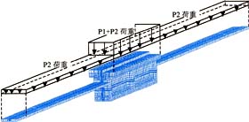 中央部10mを実橋と同様に再現し、その他の部分については等価剛性、等価質量をもつソリッド要素とする。(左図: 解析モデル)