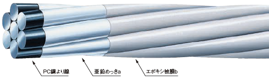 - 亜鉛めっきを施したPC鋼より線へ、さらにエポキシ樹脂塗膜をコーティングする「Dual Ultra Coat」。亜鉛めっきの優れた防錆性能に、耐塩性、耐酸性、耐アルカリ性をもつエポキシ樹脂塗膜を加えた二重構造とすることにより、それぞれの苦手とする点を補完した防錆方法です。