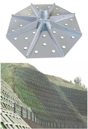 <オクトシリーズ>は、切土のり面の安定化、斜面の崩壊や地すべり防止のための受圧板として、高強度で高い信頼性を誇り、小型かつ軽量で施工性に優れています。さらに、斜面の全面緑化を容易にし、景観および環境上の問題も解決する、画期的な特長も備えています。<オクトシリーズ>製品は、ボトムプレートに植生のための多数の給排水孔を設け、施工後の全面緑化を可能にするよう工夫されています。